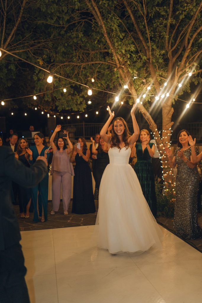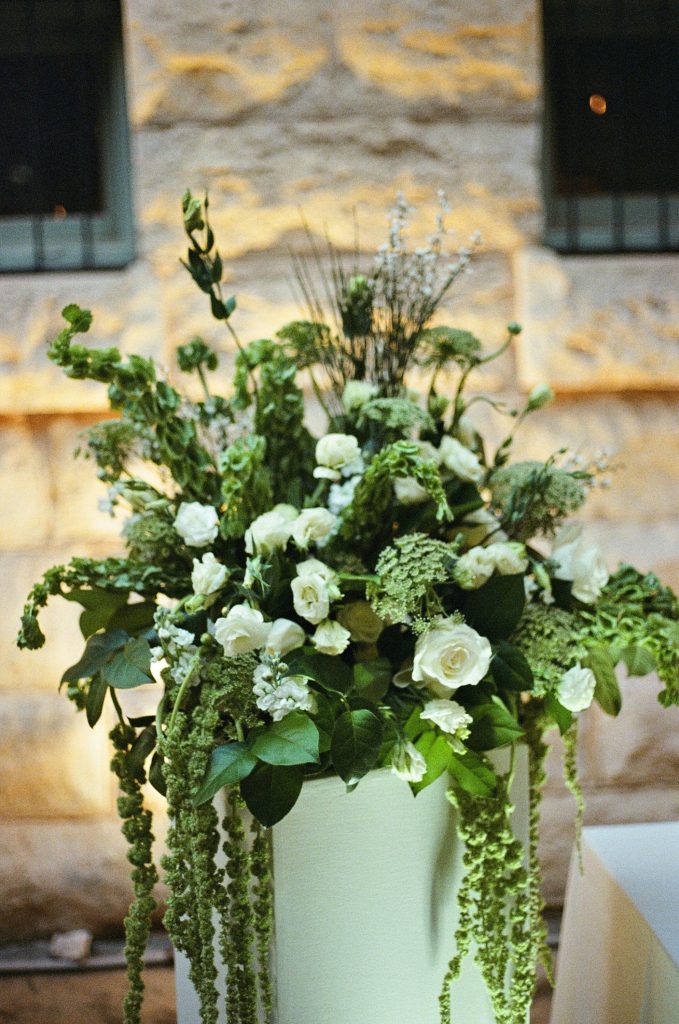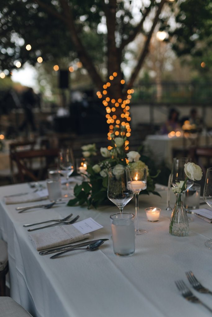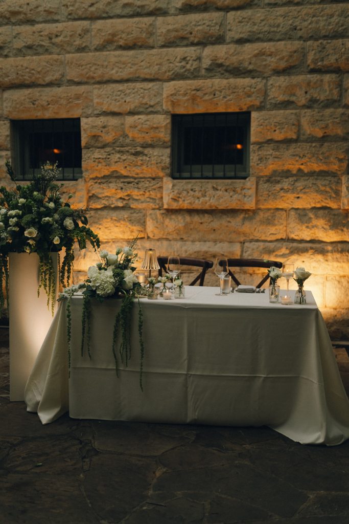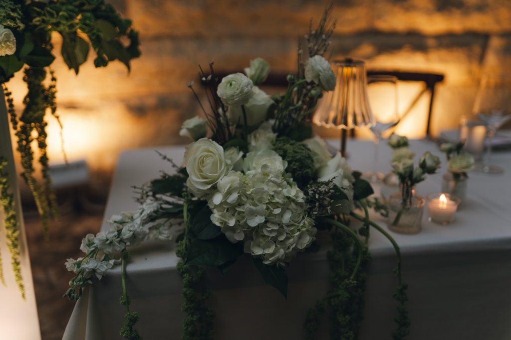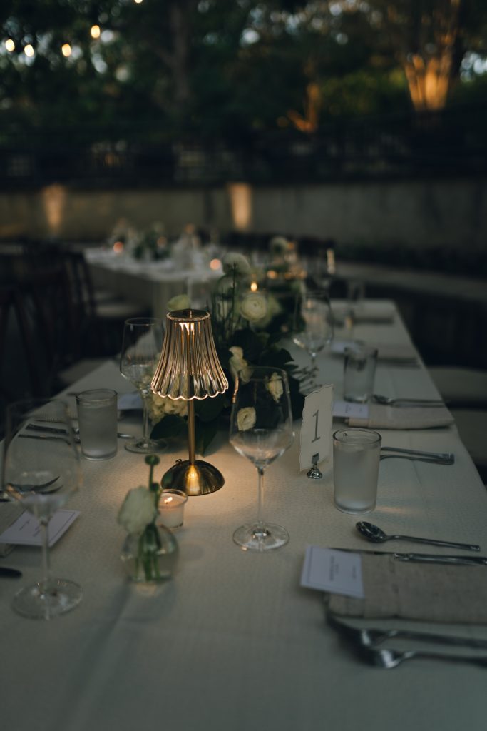 The couple’s vision was clear from the start: a garden Tuscany aesthetic with all the elements to bring a truly romantic vibe to their celebration. D Picnic Studio handled everything — planning, floral design, décor, and lighting — and they executed it flawlessly. Every single detail was curated specifically for the venue, creating a cohesive world rather than a collection of pretty things. The reception at San Antonio Botanical Garden was transformed with a crisp white dance floor, custom lighting, and centerpieces brought to life by the warm glow of table lamps and candles that complemented the garden surroundings perfectly. Even the custom menus felt like part of the design.