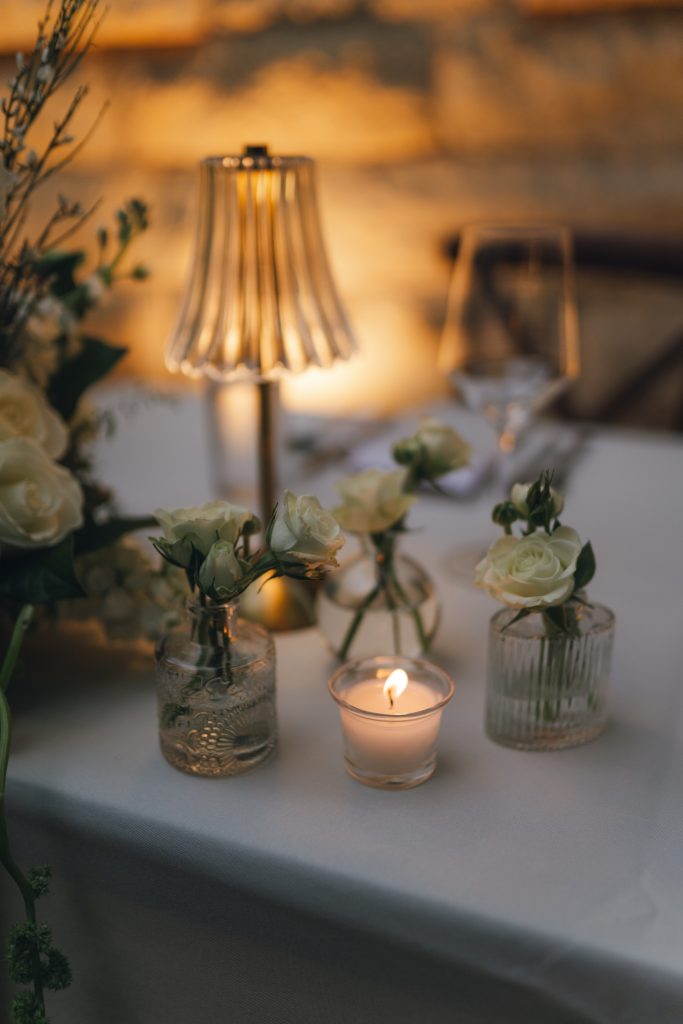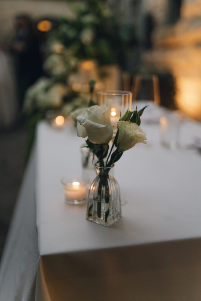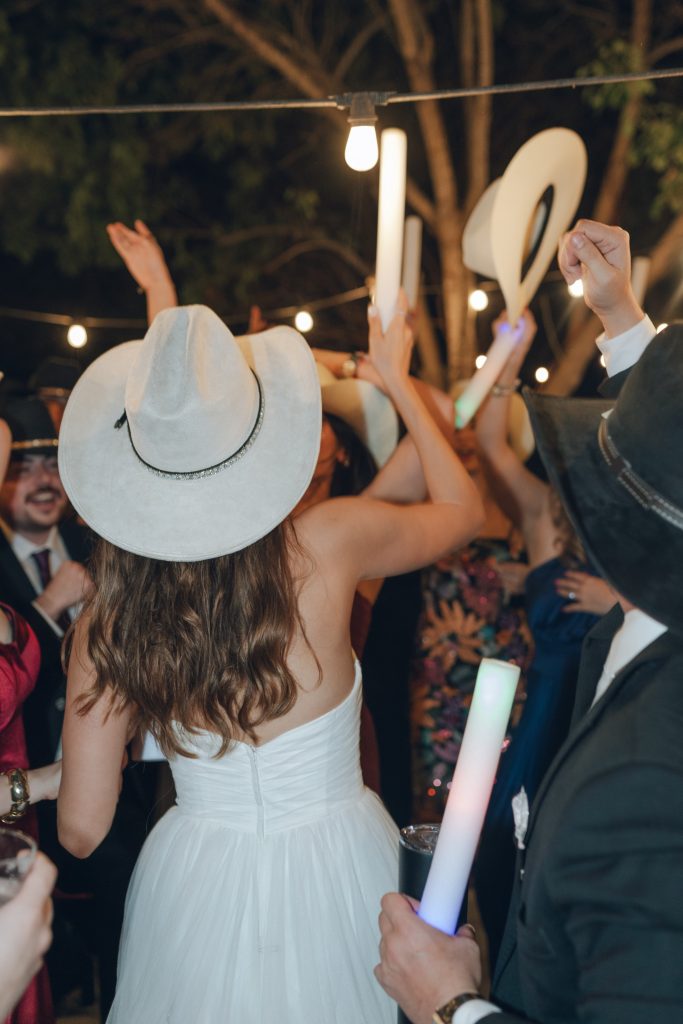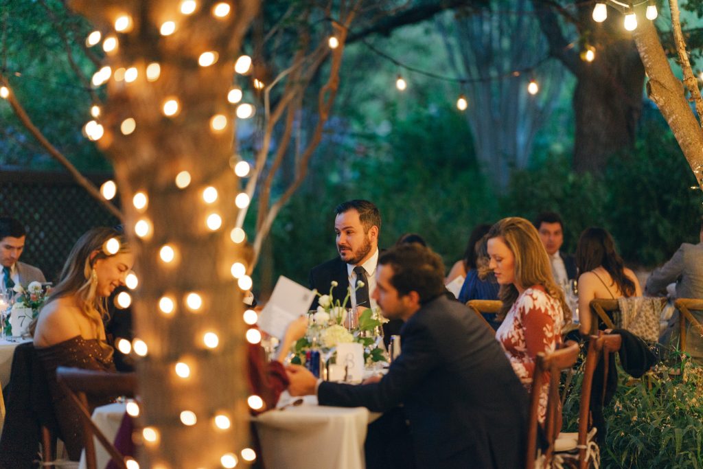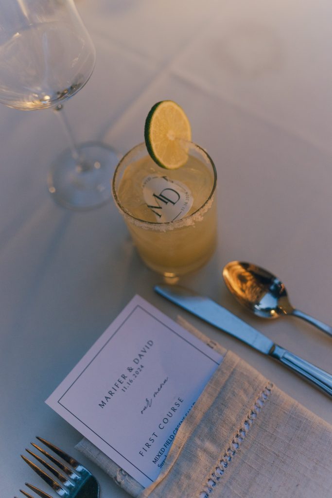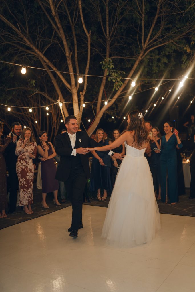 The couple’s vision was clear from the start: a garden Tuscany aesthetic with all the elements to bring a truly romantic vibe to their celebration. D Picnic Studio handled everything — planning, floral design, décor, and lighting — and they executed it flawlessly. Every single detail was curated specifically for the venue, creating a cohesive world rather than a collection of pretty things. The reception at San Antonio Botanical Garden was transformed with a crisp white dance floor, custom lighting, and centerpieces brought to life by the warm glow of table lamps and candles that complemented the garden surroundings perfectly. Even the custom menus felt like part of the design.