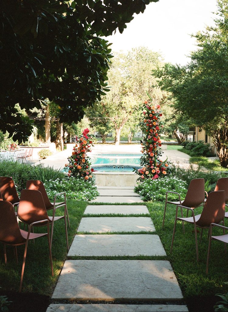 Nestled in the heart of New Braunfels, Sophie’s Gasthaus offers couples a magical garden wedding experience within its historic 1906 estate. The venue’s crown jewel is its private courtyard oasis, where lush landscaping and mature trees create an intimate garden atmosphere perfect for outdoor ceremonies and receptions. The sparkling pool serves as a stunning centerpiece, reflecting the surrounding greenery and adding a serene water element that enhances the natural beauty of the space. With some well placed colorful florals, Sophie’s Gasthaus transforms into an enchanting garden retreat where couples can exchange vows surrounded by nature’s beauty while still enjoying the elegance and amenities of a luxury boutique hotel venue.